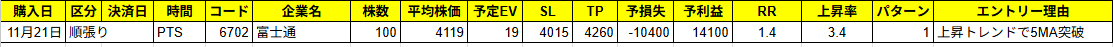 10月31日の出来高よりも上。21日は5MAを出来高を伴って陽線で上昇した。