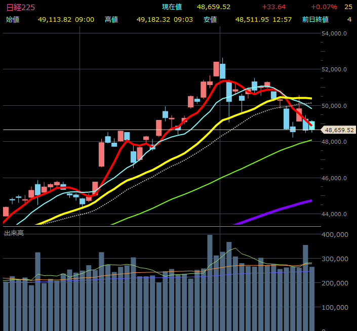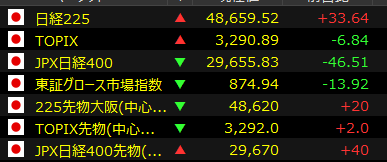 [東京 25日 ロイター] – 東京株式市場で日経平均は小幅に反発し、前営業日比33円64銭高の4万8659円52銭で取引を終えた。