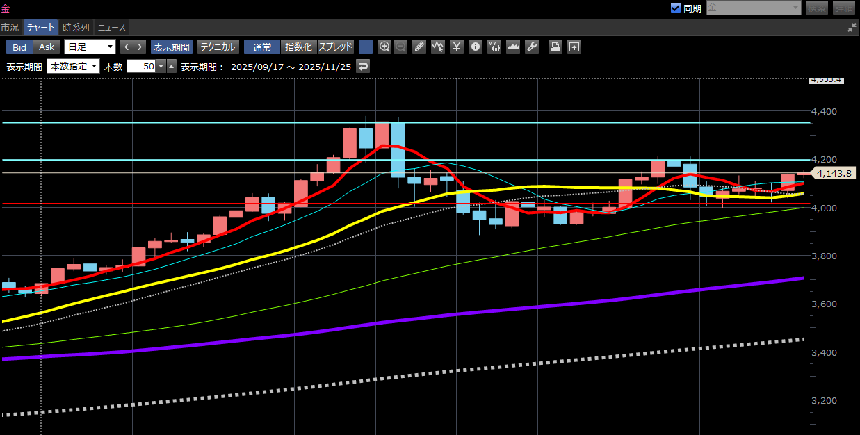 11月17日の日中摩擦の懸念でGDの陽線で超スーパー出来高をつけて現在上に位置しているので上昇しやすい。