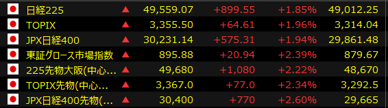 [東京 26日 ロイター] – <15:32> 大引けの日経平均は続伸、米早期利下げの思惑が支援 ハイテク株の一角に買い。東京株式市場で日経平均は、前営業日比899円55銭高の4万9559円07銭と続伸して取引を終えた。