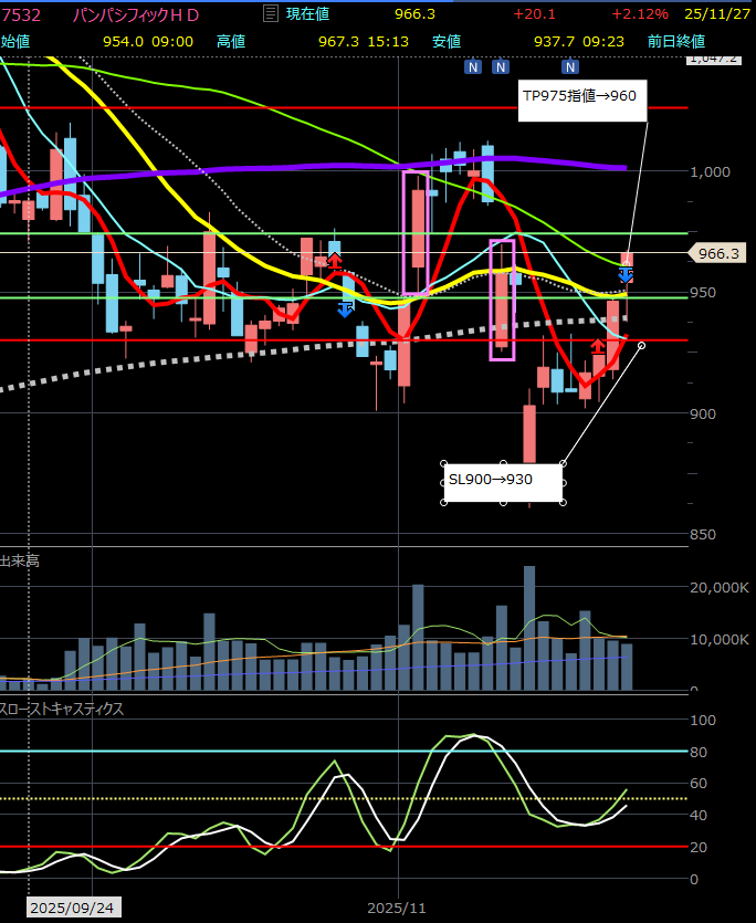 日中摩擦再燃するかと思ったので決済した。下落するなら50MAまで上昇後反発して下落すると予想したので、指値を960円に入れた。