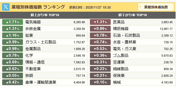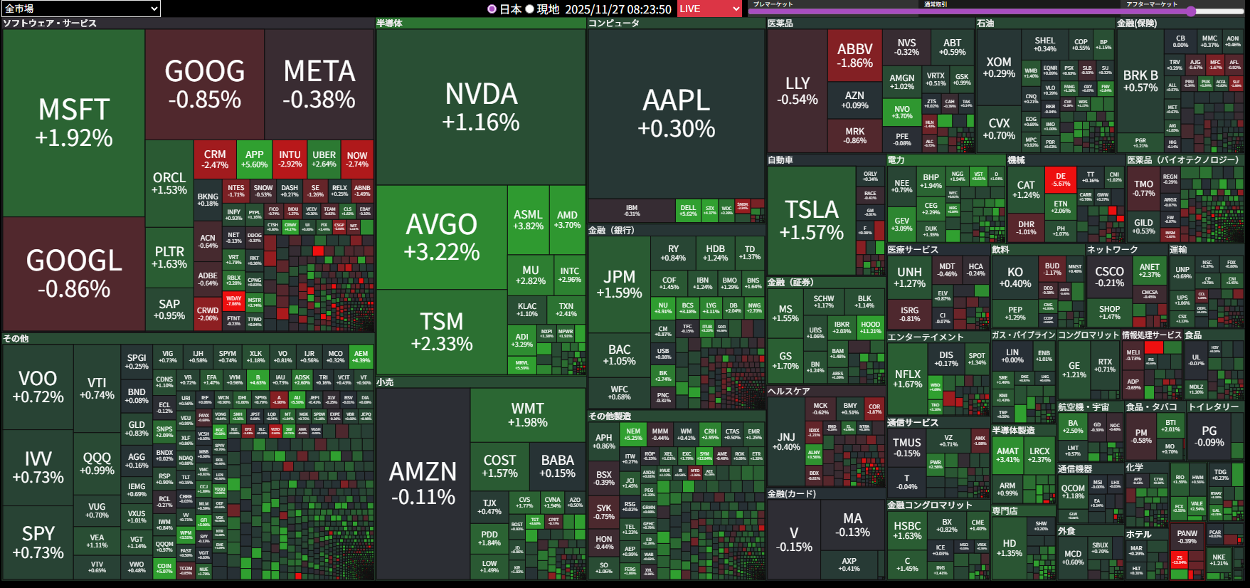 この日は航空株が大きく上げた。感謝祭の前日で、民間航空会社にとって1年で最も旅客需要が高まる日とされる。S&P1500航空指数(.SPCOMAIR), opens new tabは3.0%高。https://jp.reuters.com/markets/japan/YXXDMPA4M5KZHJK5CMLF4E5LV4-2025-11-26/