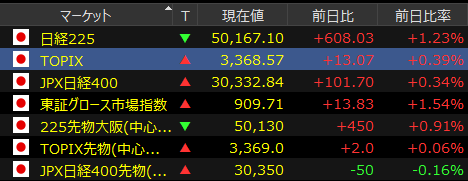 東京株式市場で日経平均は3日続伸し、前営業日比608円03銭高の5万0167円10銭で取引を終えた。