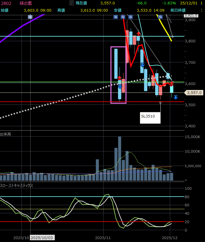 出来高大陰線を完全に下抜けたわけではないので、ヒゲを付けながらゆっくり下げていって
