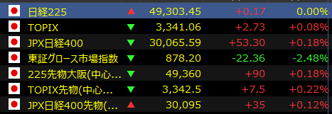 [東京 2日 ロイター] – 東京株式市場で日経平均は、前営業日比17銭高の4万9303円45銭と横ばいで取引を終えた。朝方には前日安からの自律反発を期待した買いが入ったが勢いは続かず、徐々に水準を切り下げた。後場入り後には一時マイナスに転じる場面もあり、月初の需給要因の影響も意識された。