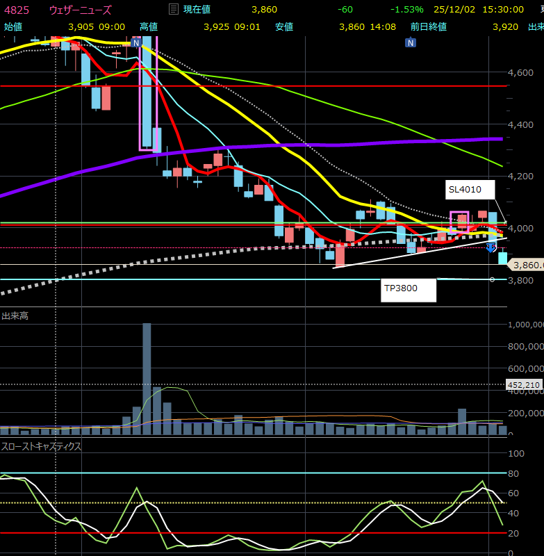 全出来高足よりも下で、全MA下向きの三角保ち合いを下抜けの陰線。
