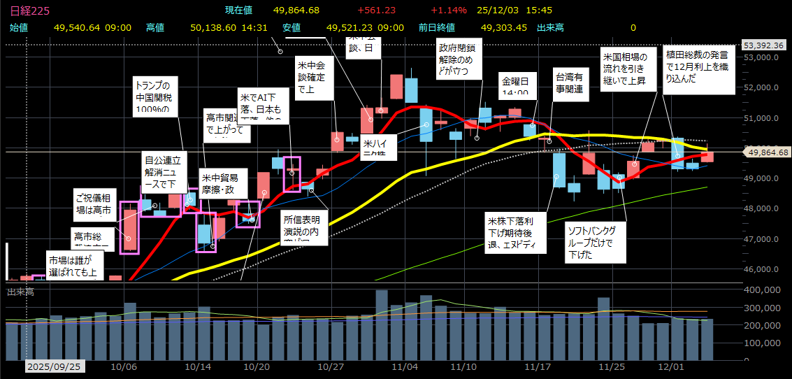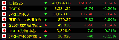 [東京 3日 ロイター] – 東京株式市場で日経平均は、前営業日比561円23銭高の4万9864円68銭と続伸して取引を終えた。前日の米ハイテク株高を受け、寄与度の高い人工知能(AI)関連株や半導体関連株が買われ、指数を押し上げた。節目の5万円を一時回復した。一方、相場全体では手掛かり難も意識され、5万円から上では利益確定売りが上値を抑えた。