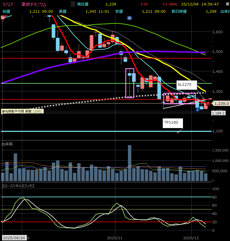 超スーパー出来高足の上で推移。下降トレンドだけど、パターン1と2になりそう。