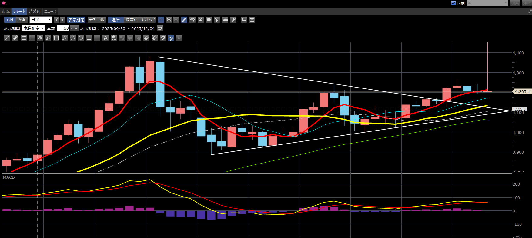 弱いADP雇用データが12月の米利下げを後押しする内容となり、一時は約0.9%高まで買われた。利息のつかない金にとって低金利環境は追い風となる。