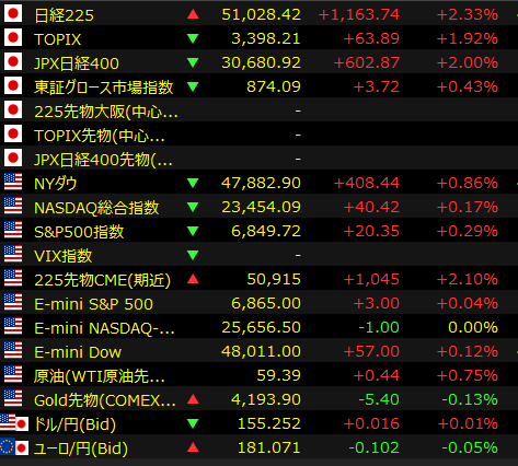 東京株式市場で日経平均は、前営業日比1163円74銭高の5万1028円42銭と3日続伸して取引を終えた。日経平均への寄与度の大きいAI(人工知能)・半導体関連の一角や機械株の上昇が指数を支援し、5万1000円を回復した。