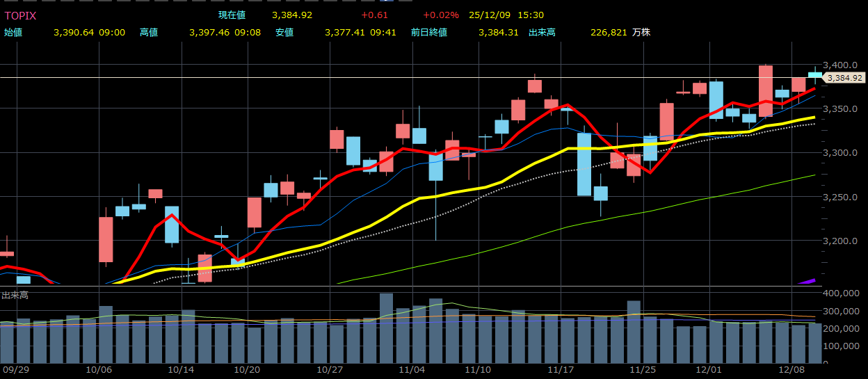 TOPIXと連動して少し上昇した。今日も5MAで反発して最高値更新。