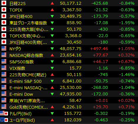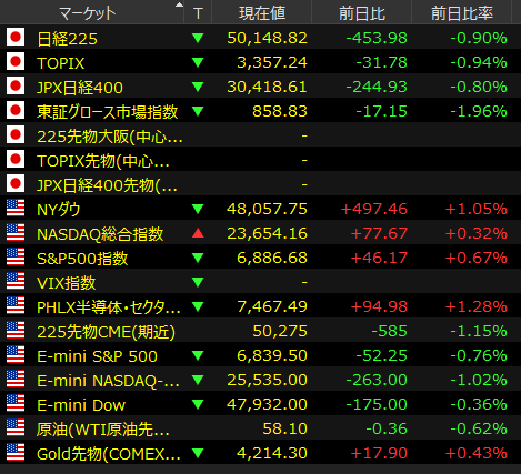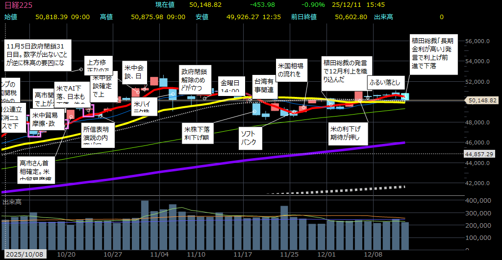東京株式市場で日経平均は2日続落し、前営業日比453円98銭安の5万0148円82銭で取引を終えた。朝方は米連邦公開市場委員会(FOMC)を無難に通過したことで反発して始まったが、材料出尽くしとの見方から利益確定売りが広がった。