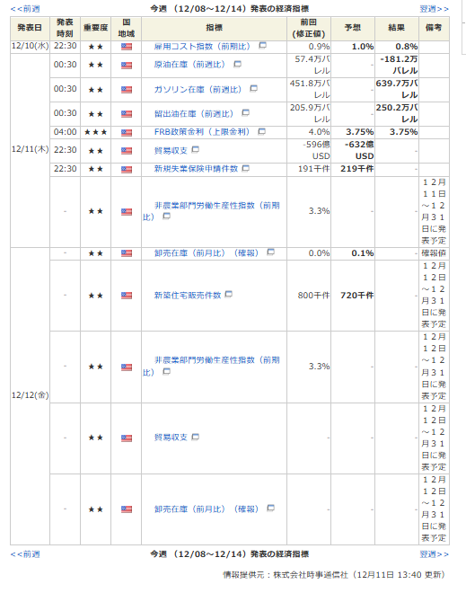 - 米CPI(10月分発表なし)11月分は12月18日22:30