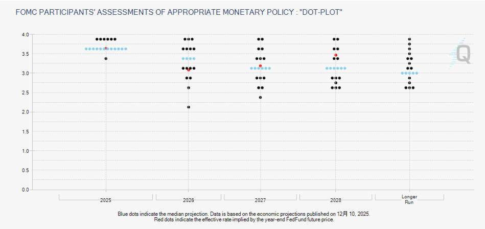 投票権を持つ12人のうち9人が利下げに賛成した。今回の利下げとFRBのトーンは、ウォール街が想定していた「タカ派的利下げ」と一致しており、当局者は2026年に1回の利下げという見通しも維持した