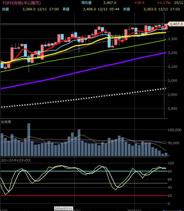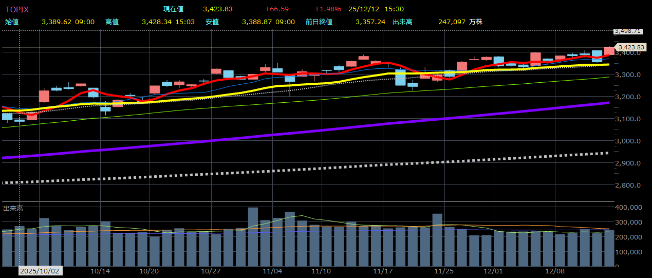 12日の日本市場は株式が大幅に反発、東証株価指数(TOPIX)は史上最高値を更新した。米国株の一部指数が利下げや景気見通しの改善を支えに最高値を付けて日本株も見直し買いが優勢だった。債券は中長期債が下落(金利は上昇)、円は下落している。