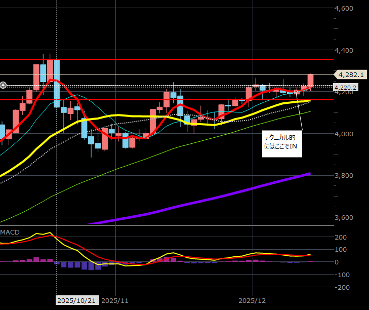 ただ、20MAが下向きなのでもう1回下落がありえる。購入早すぎた感あり