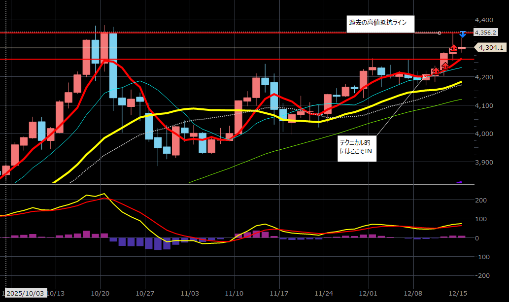 20MAで反発後上昇5MA突破で高値更新を試す。週足や月足では超えてきているので今回は成功する見込み。