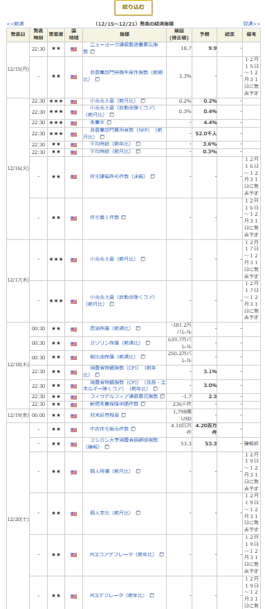 - 米CPI(10月分発表なし)11月分は12月18日22:30