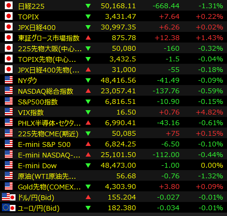 特にAI(人工知能)関連と目される銘柄が安く、相場の重しとなった。日経平均は節目の5万円を下回り、一時800円超値下がりする場面もあった。