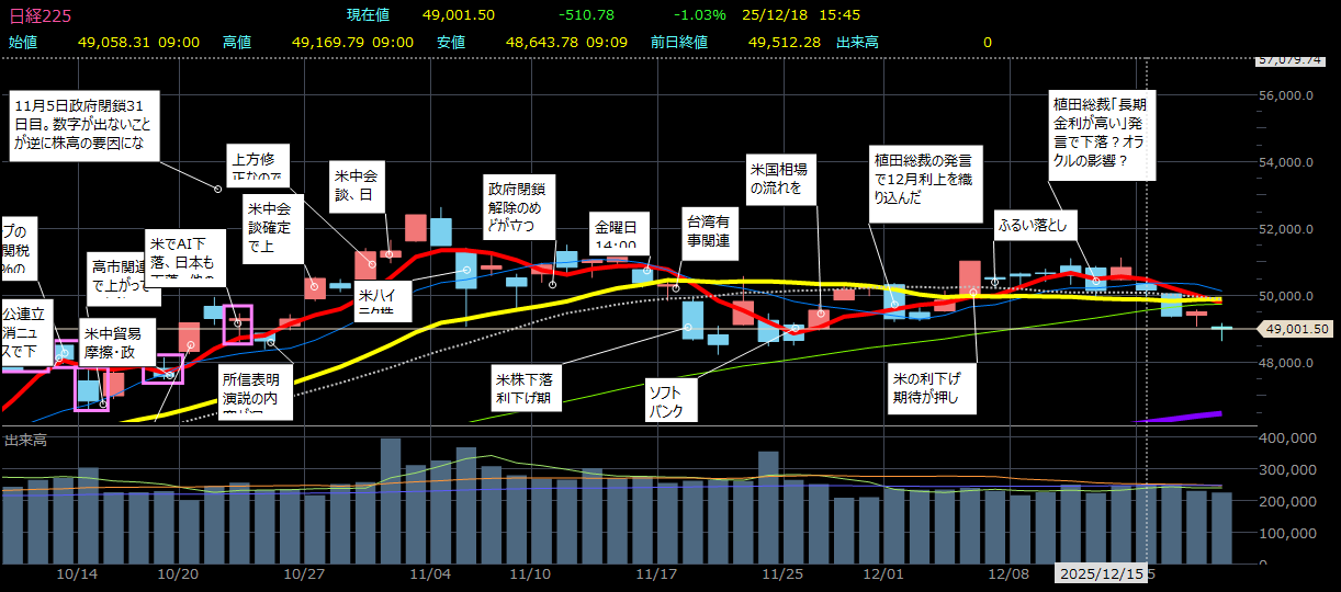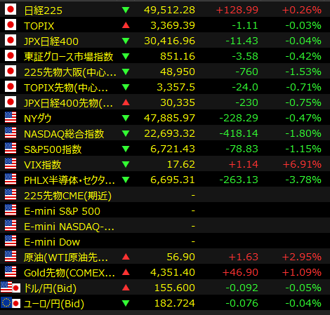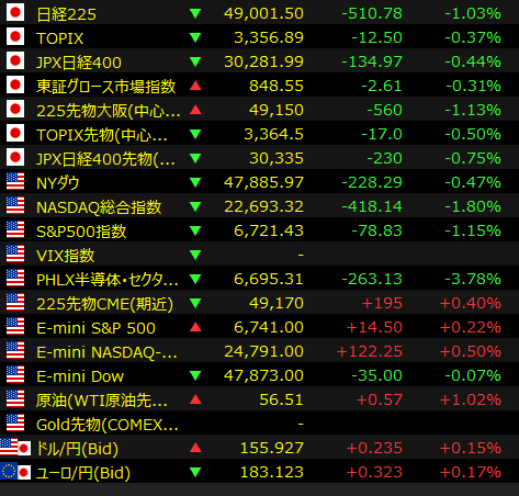 [東京 18日 ロイター] – 東京株式市場で日経平均は反落し、前営業日比510円78銭安の4万9001円50銭で取引を終えた。前日の米国株市場で、AI(人工知能)への巨額投資に対する収益性の懸念が高まり、テクノロジー株が下落した流れを引き継いだ。指数寄与度の大きい半導体株やAI関連銘柄が軟調で、相場の重しとなった。日経平均は一時800円超値下がりし、節目の4万9000円を割り込んだ。