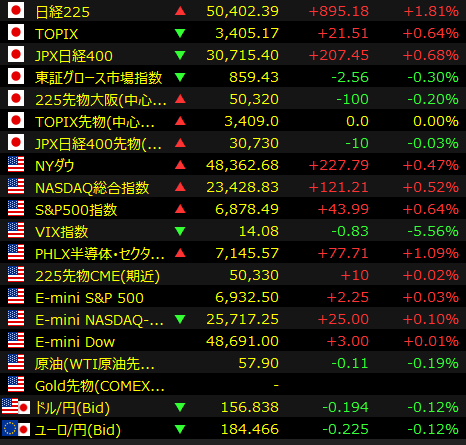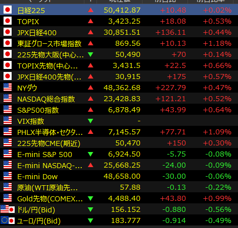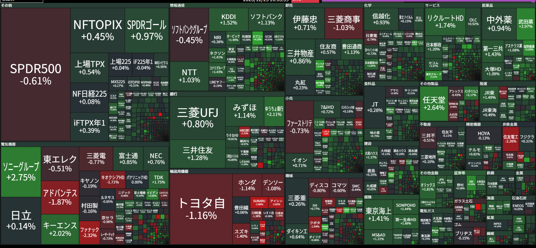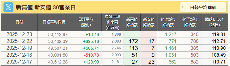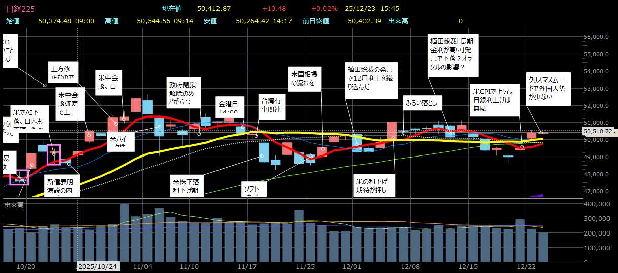 東京株式市場で日経平均は小幅に3日続伸し、前営業日比10円48銭高の5万0412円87銭で取引を終えた。クリスマス休暇を控え、参加者の減少が意識され見送りムードが強まる中、日経平均は前日終値を挟んだ一進一退が続いた。東京市場では主力のハイテク株が利益確定売りに押された半面、国内金利の低下が全体相場を支えた。