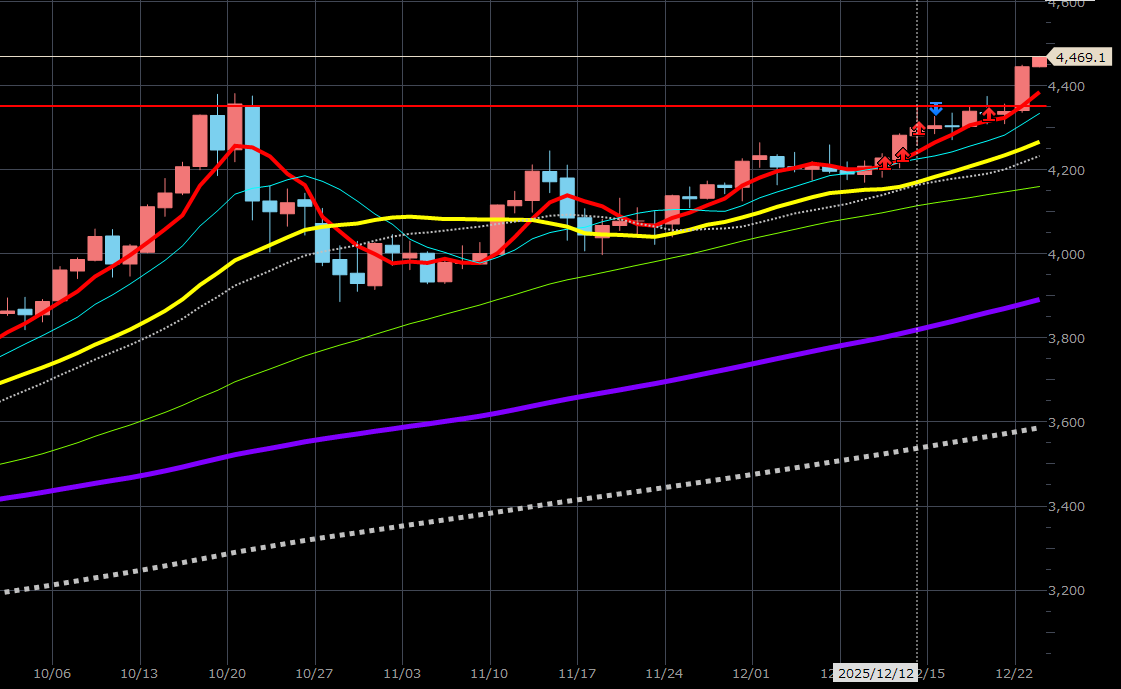 金のスポット価格は2%余り上昇し、10月に付けたこれまでの最高値1オンス=4381ドル強を上回った。貴金属は歴史的な1年の締めくくりを迎えつつあり、金と銀はいずれも1979年以来で最大の年間上昇率となる勢いだ。