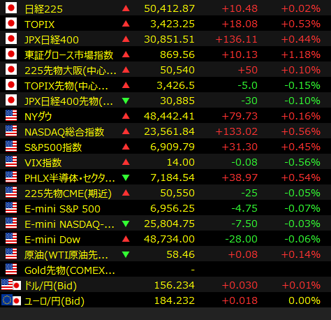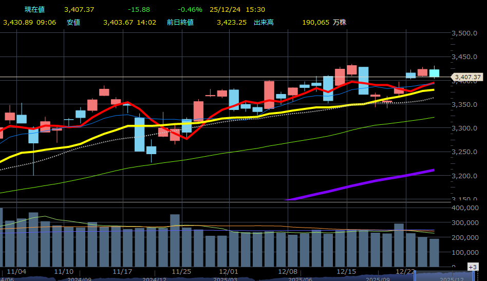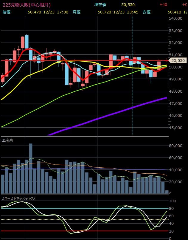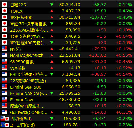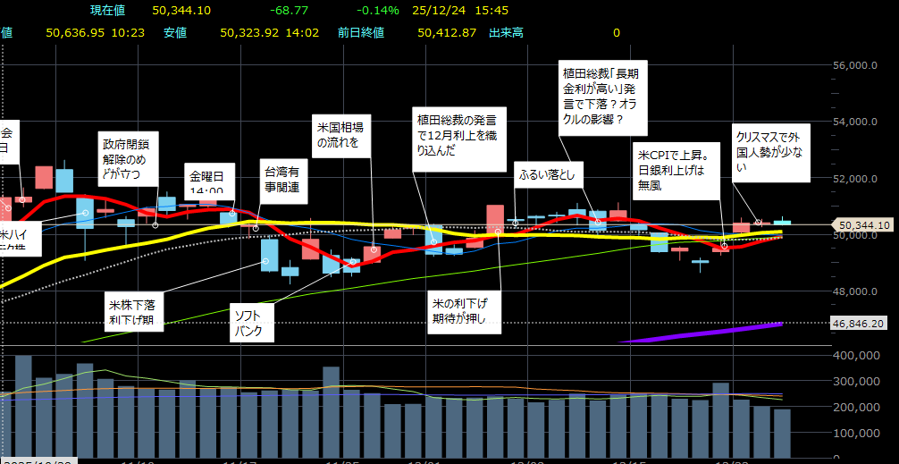 [東京 24日 ロイター] – 東京株式市場で日経平均は4日ぶりに反落し、前営業日比68円77銭安の5万0344円10銭で取引を終えた。米国市場でのハイテク株高を好感して小高く始まったが、クリスマス休暇で参加者が少なくなる中、商いは薄く方向感を欠く値動きとなった。