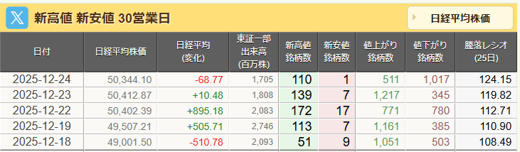 「材料に乏しく商いが薄い中、損益通算とみられる売りが上値を抑えた」(フィリップ証券の増沢丈彦株式部トレーディング・ヘッド)との見方が聞かれた。今年は指数が上昇し全般的にパフォーマンスが良好となり、年末には含み損のある銘柄の損を確定し納税額を圧縮する「損益通算」の動きが強まりやすいとみられている。 日経平均は4日ぶり小反落 クリスマス休暇で商い薄く方向感欠く東京株式市場で日経平均は4日ぶりに反落し、前営業日比68円77銭安の5万0344円10銭で取引を終えた。米国市場でのハイテク株高を好感して小高く始まったが、クリスマス休暇で参加者が少なくなる中、商いは薄く方向感を欠く値動きとなった。