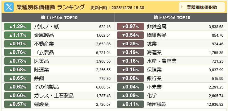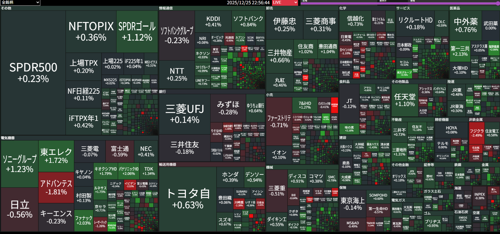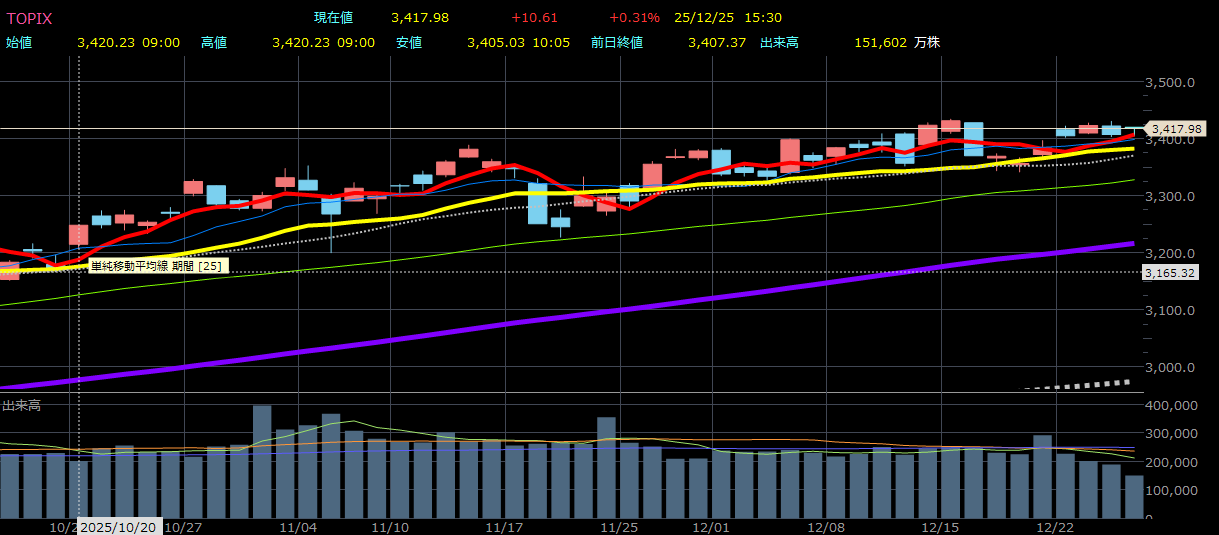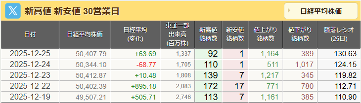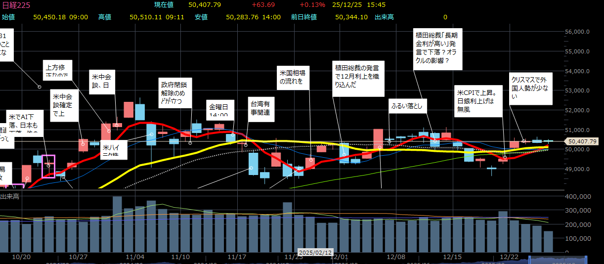 [東京 25日 ロイター] – 東京株式市場で日経平均は小幅に反発し、前営業日比63円69銭高の5万0407円79銭で取引を終えた。海外勢がクリスマス休暇に入り参加者も手掛かり材料が少ない中、前日終値を挟んだ小動きが続いた。売買代金は3兆円を下回り、今年最低となった。