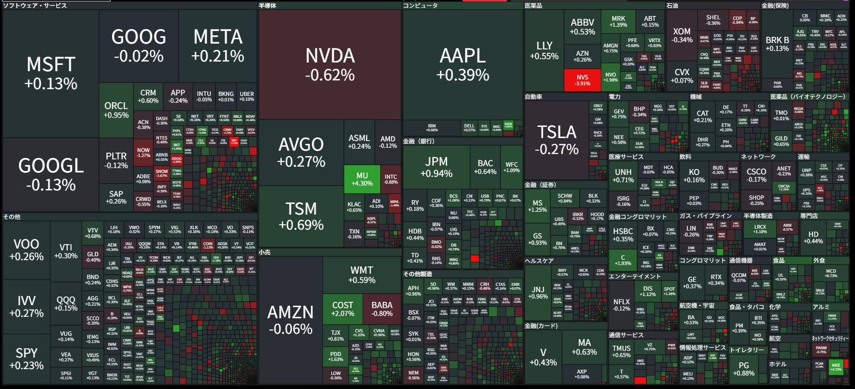 マイクロン・テクノロジー(MU.O), opens new tabは3.8%上昇し、終値での最高値を更新。先週示した強気の業績見通しを好感した買いが続いている。 米国株式市場=ダウ・S&P最高値、ナイキやマイクロンが高い米国株式市場は、ダウ工業株30種とS&P総合500種が終値で最高値を更新した。クリスマスイブの短縮取引で、薄商いとなる中、主要株価3指数はそろって5営業日続伸した。