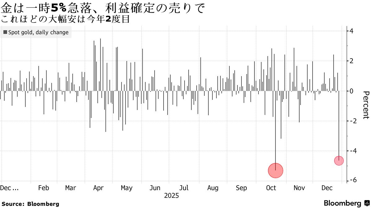 金スポット価格は一時5%下落し、10月21日以来の大幅安となった。金が1日にこれほど大幅な下げを記録したのは今年2度目。同日のアジア時間に84ドルと最高値を付けていた銀も一時11%急落し、2020年9月以来の下げとなった。年末の休暇シーズンに入り金・銀はともに最高値を更新しており、記録的な値上がりが過度に急ピッチであったことを示唆した。