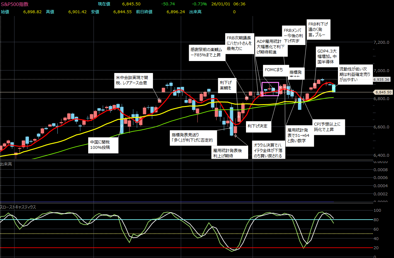 - 米国のベネズエラ地上攻撃開始(ベネズエラ近隣諸国含む)→とても強い上昇要因→そうでもないので、ニュースなどで本格的に報道されてからかな