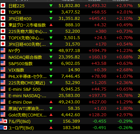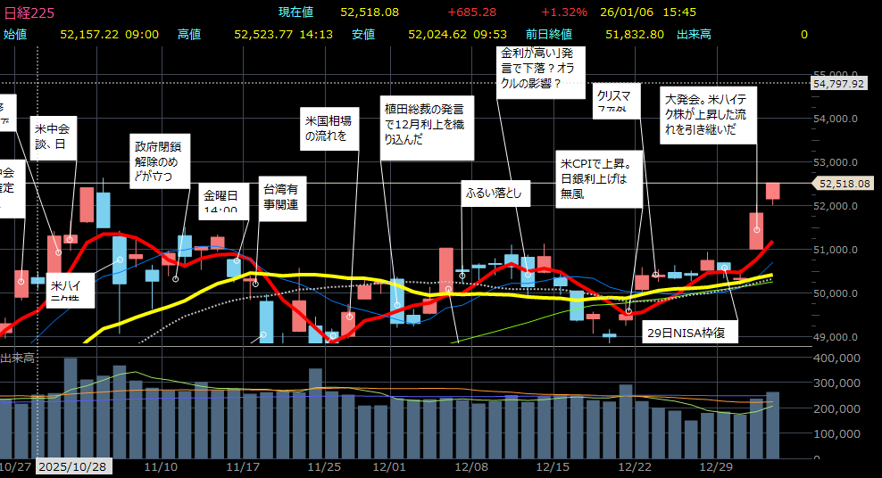 [東京 6日 ロイター] – 東京株式市場で日経平均は続伸し、前営業日比685円28銭高の5万2518円08銭で取引を終えた。終値ベースの史上最高値を2025年10月31日以来、約2カ月ぶりに更新した。前日の米国市場での株高を受け、上昇に弾みがついた。TOPIXは取引時間中と終値ベースで最高値を更新した。日経平均は約300円高で寄り付いた後も上値を伸ばし、高値圏でのもみ合いが続いた。AI(人工知能)・半導体関連や景気敏感株を中心に物色され、後場には一時690円高の5万2523円に上昇した。