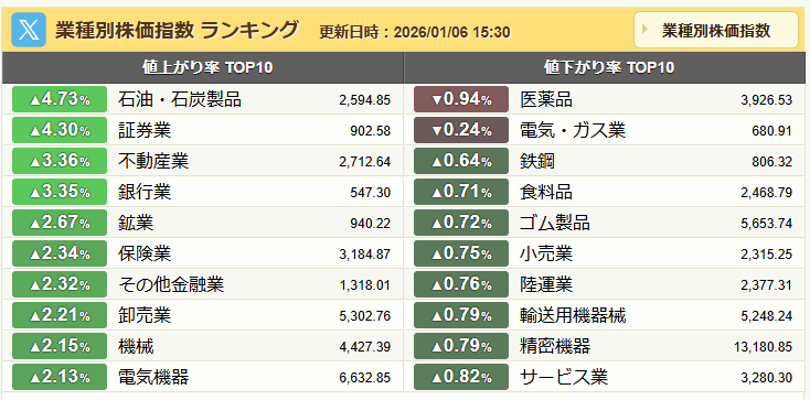ベネズエラの石油資源に米企業がアクセスできるようになるとの見方から米市場でエネルギー株が上昇した流れを受け、石油・石炭製品や鉱業が大幅高となった。長期金利が上昇する中、銀行や保険もしっかりだった。
