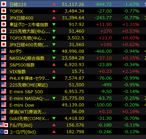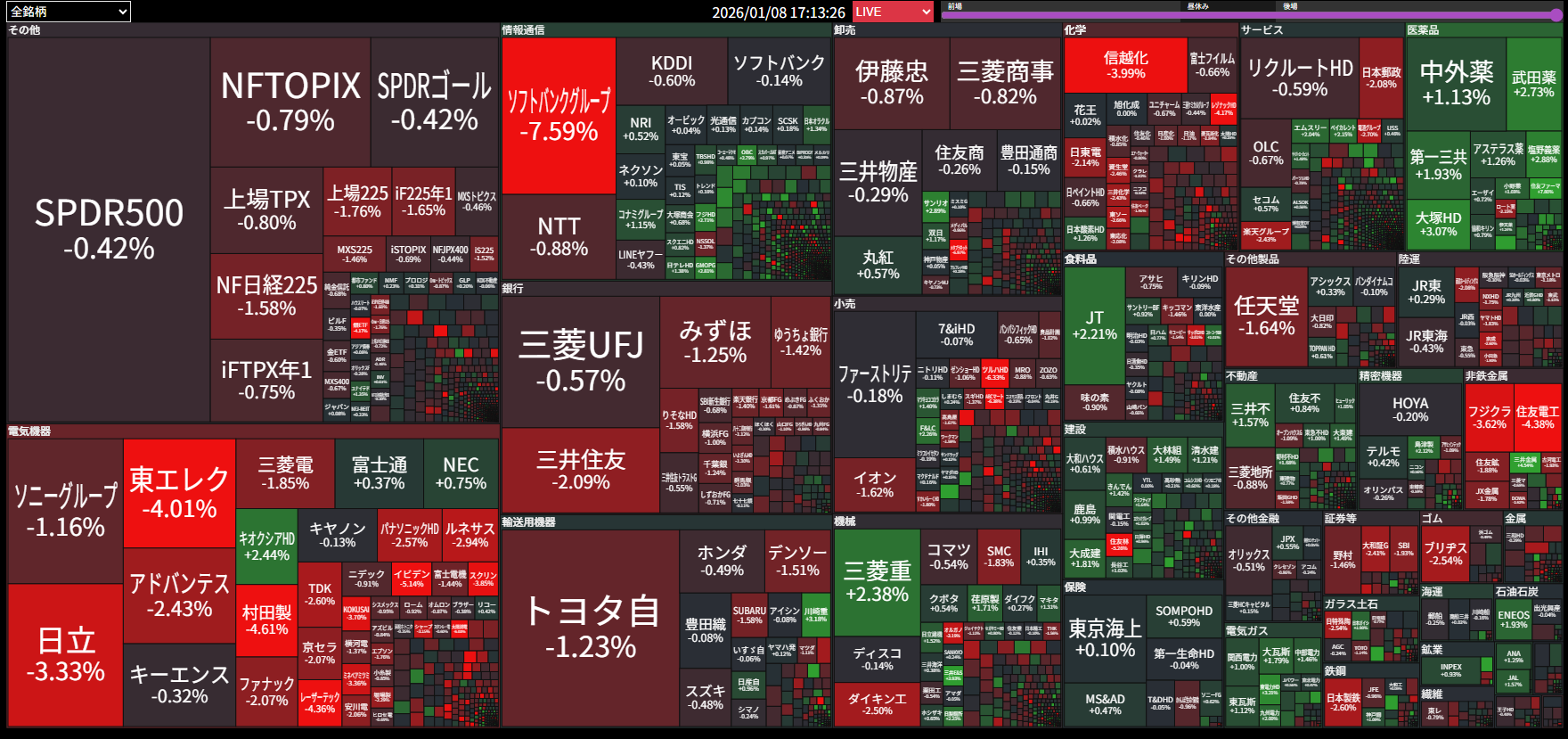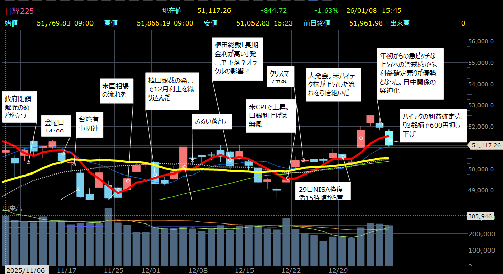 2026年1月8日午後 4:18 GMT[東京 8日 ロイター] – 東京株式市場で日経平均は大幅に続落し、前営業日比844円72銭安の5万1117円26銭で取引を終えた。年明けに指数をけん引してきたAI(人工知能)・半導体株に利益確定売りが出て、相場の重しとなった。後場終盤に、中国当局が一部企業に対して米エヌビディア(NVDA.O), opens new tabのGPU発注の一時停止を要請したと伝わると、半導体関連が一段安となり日経平均は一時900円超下落した。