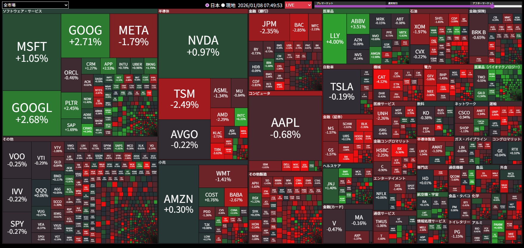 2026年1月8日午前 6:42 GMT+957分前更新[ニューヨーク 7日 ロイター] – 米国株式市場ではS&P総合500種が反落して取引を終えた。JPモルガンやブラックストーンなど金融株の下げが重しとなった。一方、エヌビディアやアルファベットなど人工知能(AI)関連銘柄が買われ、ナスダック総合は続伸した。 S&P500は取引時間中の最高値を更新する場面もあった。 トランプ米大統領は7日、住宅価格抑制に向け、大手機関投資家による一戸建て住宅の購入を禁止する措置を講じると表明した。これを受け、ブラックストーン(BX.N), opens new tabとアポロ・グローバル・マネジメント(APO.N), opens new tabが5%超下落。S&P金融指数(.SPSY), opens new tabを押し下げた。 JPモルガン・チェース(JPM.N), opens new tabは投資判断引き下げを嫌気して2.3%安となった。