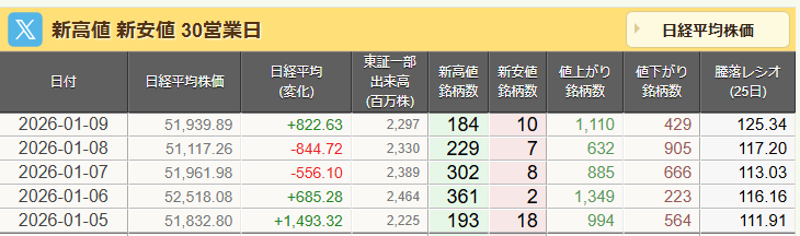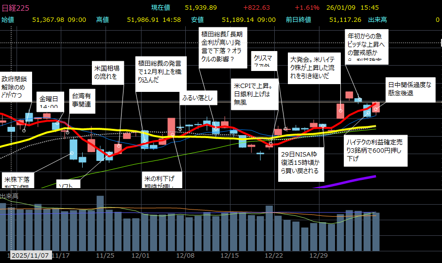 2026年1月9日午後 4:10[東京 9日 ロイター] – 東京株式市場で日経平均は3日ぶりに反発し、前営業日比822円63銭高の5万1939円89銭で取引を終えた。前日に決算を発表したファーストリテイリング(9983.T), opens new tabが急騰し、日経平均を押し上げた。日中関係の悪化に対する過度な懸念が緩和する中、幅広い銘柄が物色され、午後にかけて堅調な地合いが続いた。