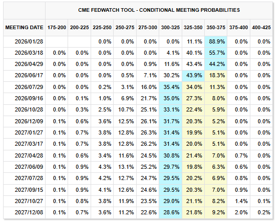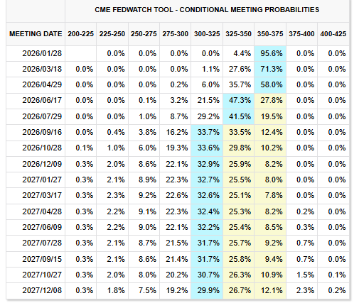 国債 直近値 前営業日比(bp) 変化率 米30年債利回り 4.81% -2.6 -0.55% 米10年債利回り 4.16% -0.4 -0.09% 米2年債利回り 3.53% 4.6 1.32% 米東部時間 16時40分 金利スワップ市場では、1月利下げの可能性をほぼ完全に排除しているものの、年内に合計約0.5ポイントの利下げを引き続き織り込んでいる。
