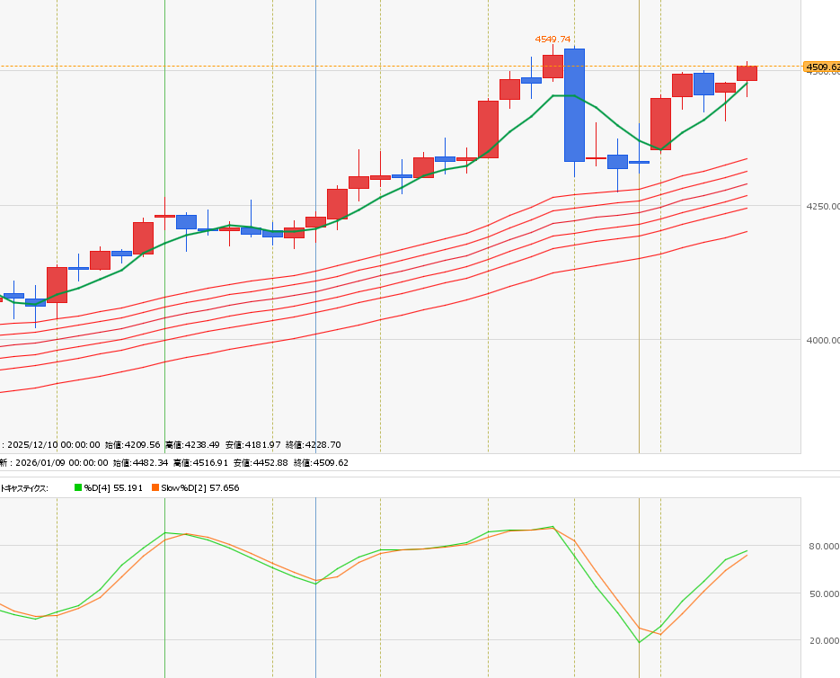 - 1月9日の2日前7日(木曜夜)から様子見の調整が入りやすいので日米ともに下落しそう→正解だった