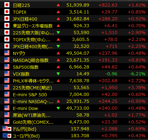 業種別で自動車を含む輸送用機器は上昇率2位。ドル/円が円安方向に推移したことも追い風になった。国内金利の上昇基調を背景に、銀行株はしっかり。大型株を中心に買われ、海外投資家による個別株への資金流入への観測も聞かれた。 日経平均は3日ぶり反発、ファストリ株高が寄与 日中関係への懸念和らぐ東京株式市場で日経平均は3日ぶりに反発し、前営業日比822円63銭高の5万1939円89銭で取引を終えた。前日に決算を発表したファーストリテイリングが急騰し、日経平均を押し上げた。日中関係の悪化に対する過度な懸念が緩和する中、幅広い銘柄が物...