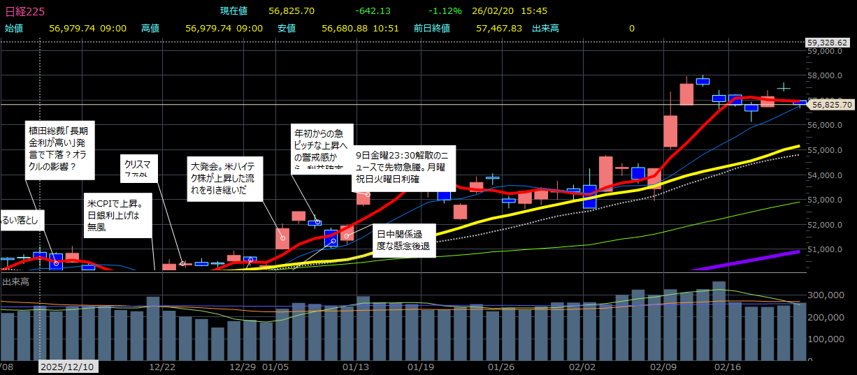 2026年2月20日午後 4:07[東京 20日 ロイター] – 来週の東京株式市場は、横ばい圏での推移が想定されている。決算発表が一巡し手掛かりが少なくなる中、最高値を再びトライする動きにはなりにくいという。日経平均は5万7000円を中心とした値動きとなりそうだ。一方、国内が連休の間に中東情勢の緊張が高まった場合は売りが強まるリスクもあり、注意が必要との声が聞かれた。
