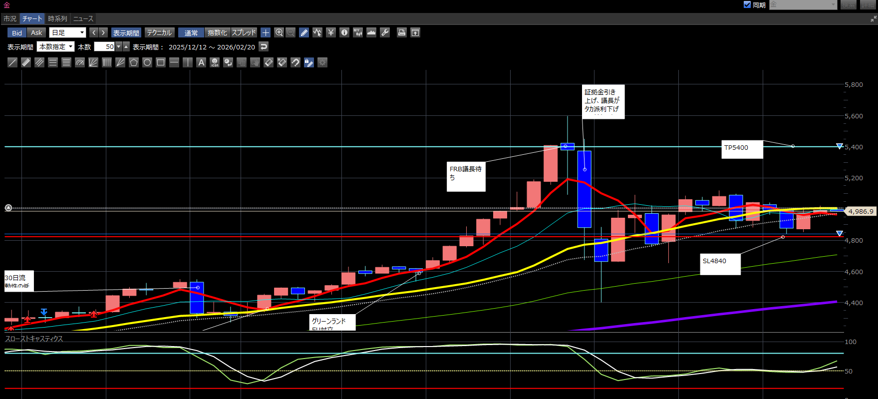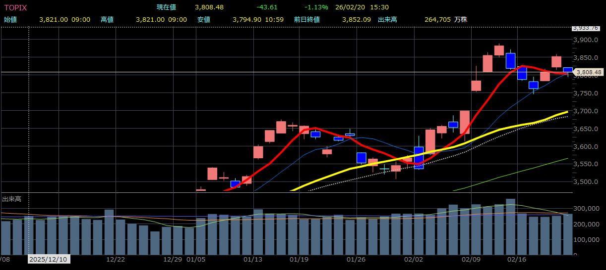- 主力株の調整: トヨタ(4%安)や東京エレクトロン(5%安)など、これまで相場を牽引してきた大型株や半導体株に売りが波及。
