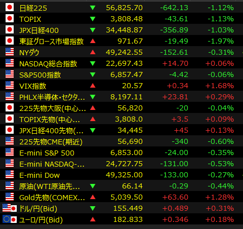 本日の東京株式市場は、外部環境の悪化を受けて日経平均株価が**前日比642円安(56,825円)**と大幅に値下がりしました。週末の3連休を前に、幅広い銘柄で利益確定売りが先行しています。