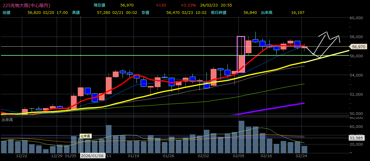 日経平均は衆院選後の2月12日に5万8015円08銭の高値を付けた後、過熱感を冷ます調整がみられた。長期でみれば上昇トレンドが維持されているとみる市場関係者は多いものの、「来週1週間は材料難で、どんどん上を試す展開にはなりにくいのではないか」(野村証券のエクイティ・マーケット・ストラテジスト、澤田麻希氏)との声が聞かれる。日経平均は5万7000円近辺を軸に一進一退の展開が予想されている。一方、中東情勢を巡る警戒感は、相場の重しとなりやすいとの指摘がある。トランプ米大統領は19日、イランが核開発計画を巡り合意しなければ「本当に悪いことが起きる」と警告した。また、米国がイランに対する行動に踏み切る可能性については、今後10─15日を期限とする考えを示唆した もっと見る 。
