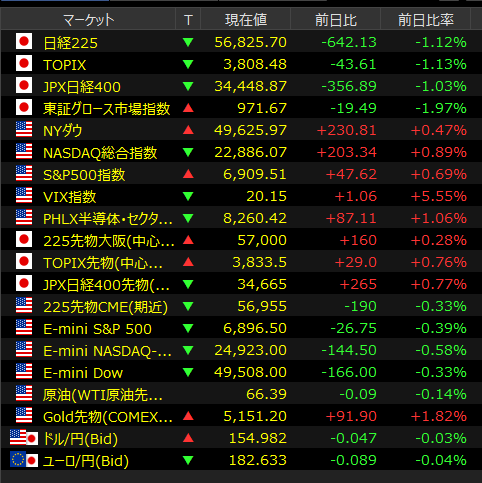 本日の東京株式市場は、外部環境の悪化を受けて日経平均株価が**前日比642円安(56,825円)**と大幅に値下がりしました。週末の3連休を前に、幅広い銘柄で利益確定売りが先行しています。