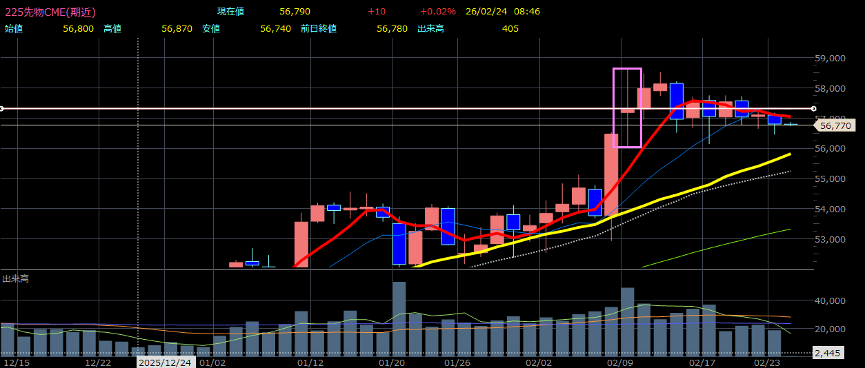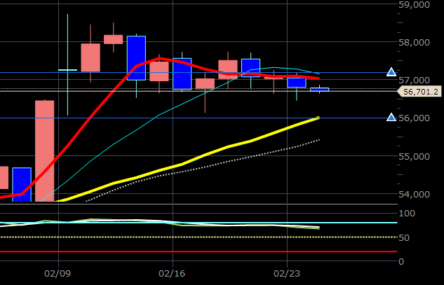 23日月曜日は下落。昨夜の米国株の下落を受けて日本株も25MA(56000円)あたりまで下落しそう。