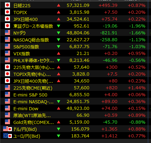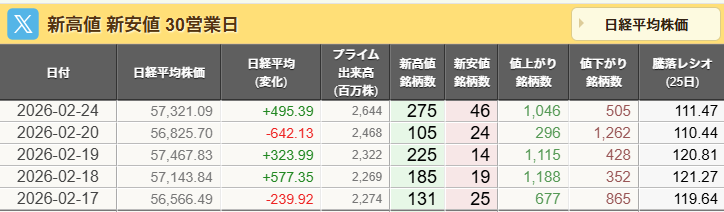 2026年2月24日午後 4:22[東京 24日 ロイター] – 東京株式市場で日経平均は反発し、前営業日比495円39銭高の5万7321円09銭で取引を終えた。米株安やトランプ関税を巡る不透明感から売りが先行したが、週内に控える米エヌビディア(NVDA.O), opens new tabの決算を先取りする買いが半導体関連株の一角に入って指数を押し上げた。国内の政策期待を背景に、前週末の下落を経て押し目買いが入りやすかったとの見方もあった。